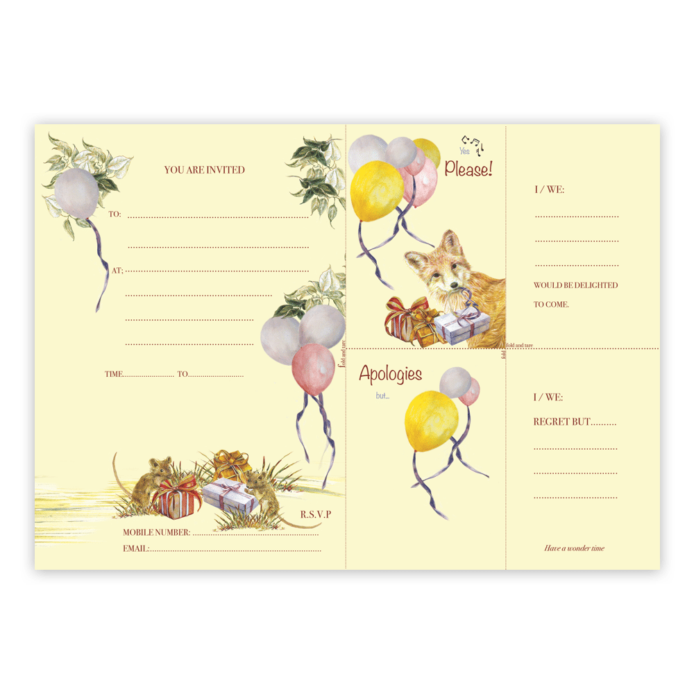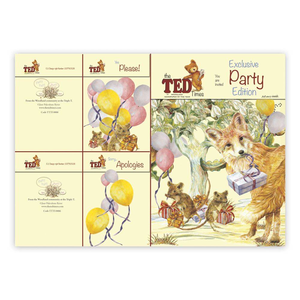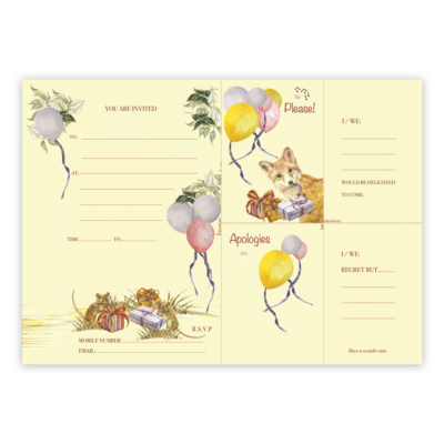 Start the party early by adding extra fun and tactile engagement with the Ted Times Children’s party Invitations; Whether you send or receive a Combination reply card, colourfully Illustrated Woodland Animals will deliver your message. The recipient then enjoys making their smaller reply card from part of the invitation you just sent them, saving time, money and trees. Quirky, fun, and a big hug for our Woodlands.