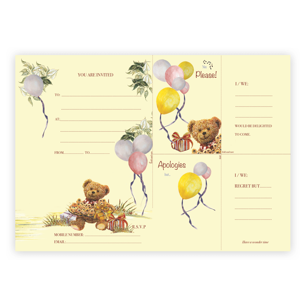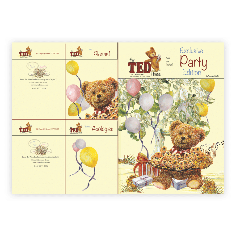 Start the party early by adding extra fun and tactile engagement with the Ted Times Children’s party Invitations; Whether you send or receive a Combination reply card, colourfully Illustrated Woodland Animals will deliver your message. The recipient then enjoys making their smaller reply card from part of the invitation you just sent them, saving time, money and trees. Quirky, fun, and a big hug for our Woodlands.