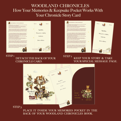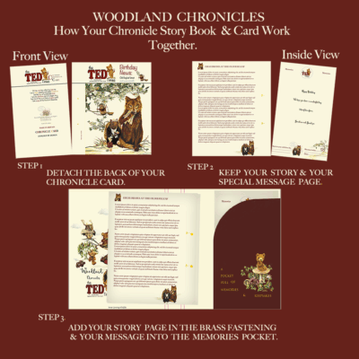Find all of your Favourite Woodland Characters in One Place by combining your newly transformed Chronicle Story Cards within the folds of this specially designed Book.  Follow and join in their Stories as you Build Your Own Storybook. This is the ultimate illustrated Keepsake to collect your Bright, Informative and Funny Story Card pages in, with a Specially Designed Memories pocket to keep all of those Special Messages sent to you from the ones you love. A book you can add to, read, and re-read, in the knowledge that you have helped save our ‘Ancient Woodlands’, preserved our sustainable forests, and protected their ‘Home’ just by giving and receiving this gift.